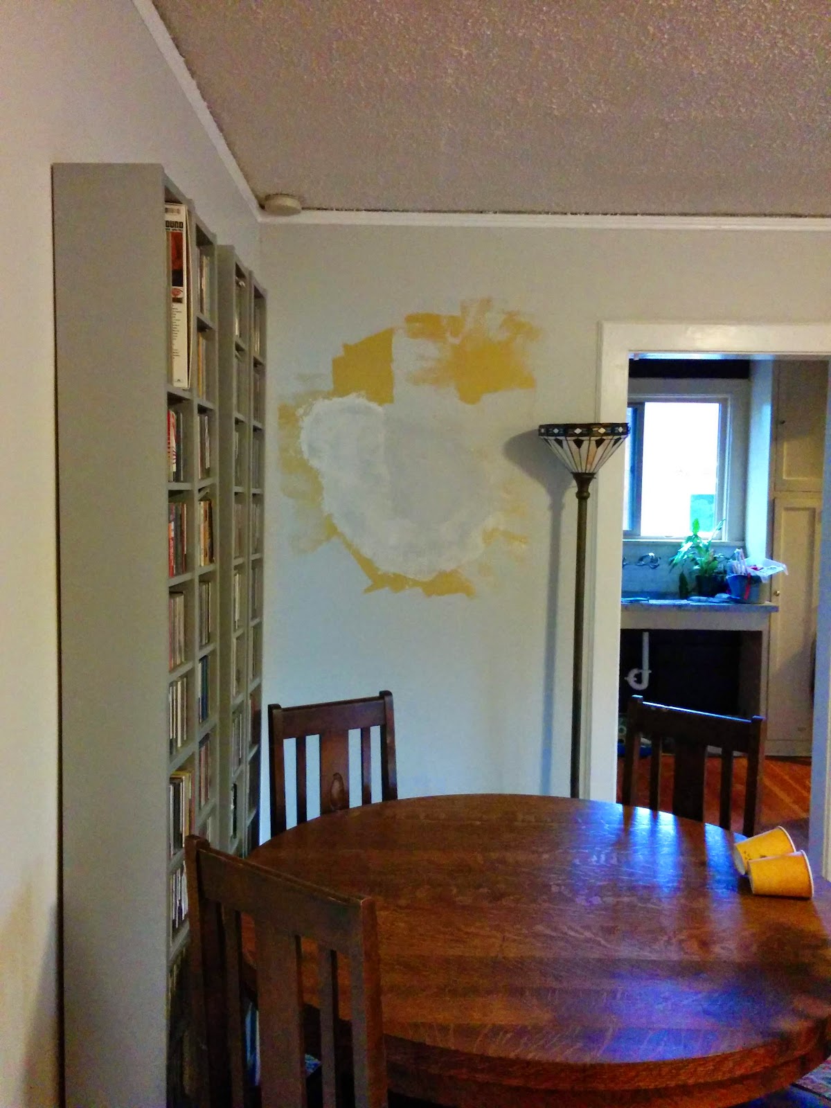 Above the window, the wall board is bulging out. Note the yellow. Holy CRAP, the yellow. |