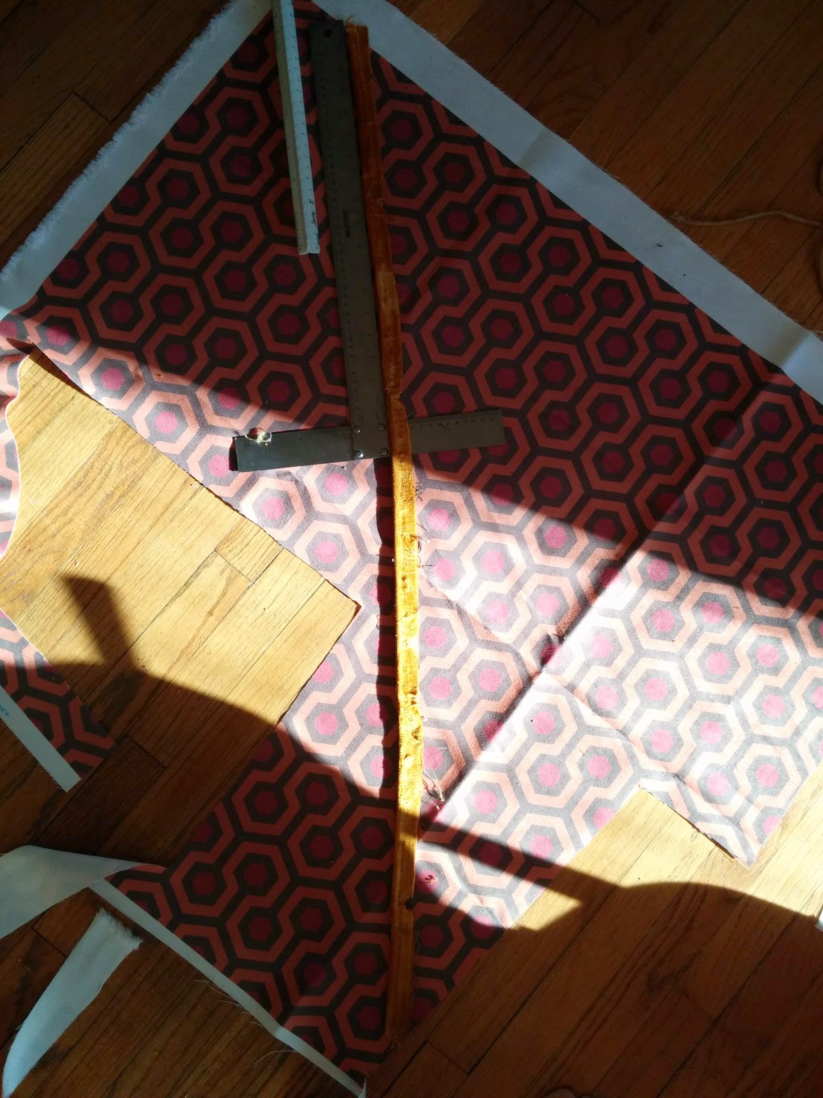 The center is pinned so I can align front to back. I cut this panel first, then the upper panel. I wanted the illusion of the hexes joining from seat to back. This took a bit of work, since I had to compensate for the width of the seat cushion.